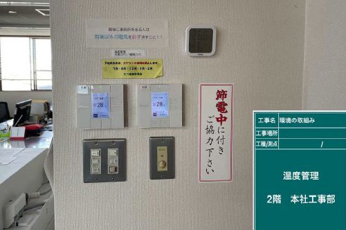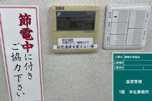 エアコン管理者を毎月会議に選任し、温度設定を冷房28度・暖房20度にして管理している。又、7月・8月・12月・1月以外のエアコンの使用を制限している。